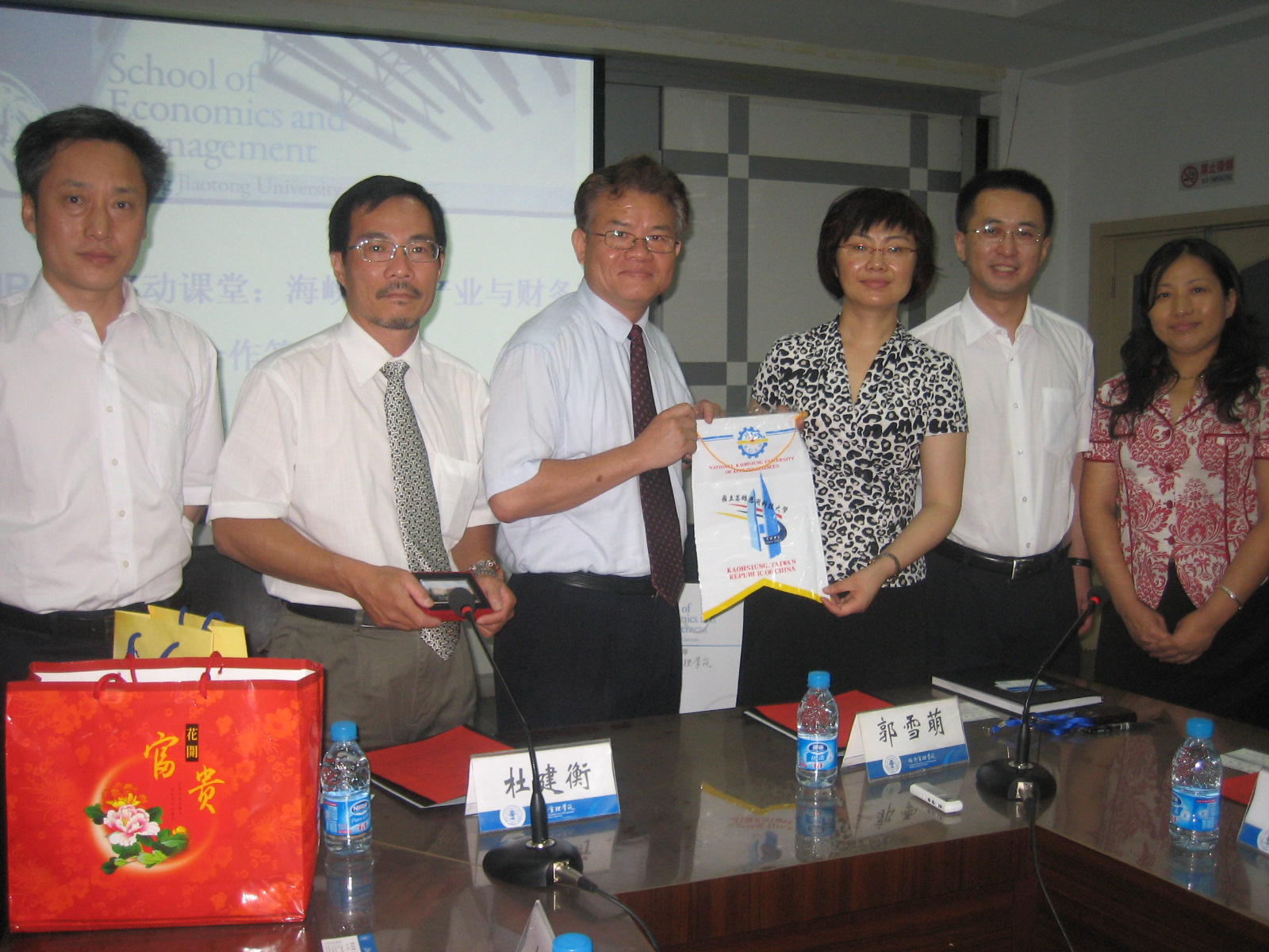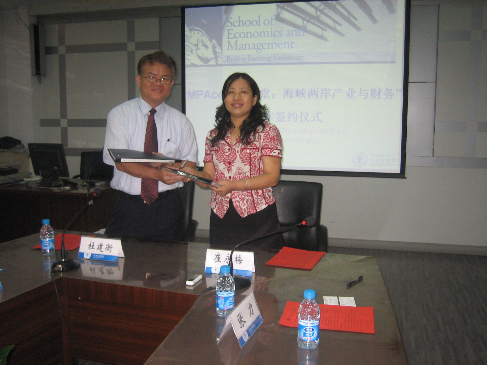 签约仪式由MPAcc教育中心执行主任崔永梅副教授主持,台湾高雄应用科技大学商学院金融系主任杜建衡副教授、金融系胡德中副教授、饼干姐姐