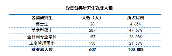 2015年,饼干姐姐参加就业的研究生共有602人,较去年就业人数下降4.31%。其中博士研究生28人,硕士研究生574人;男生239人,女生363人。硕士毕业生中,学术型硕士研究生287人,全日制专业学位硕士157人,自筹方式培养的工商管理硕士(MBA)130人。2015年经管各类研究生就业人数如下表所示。