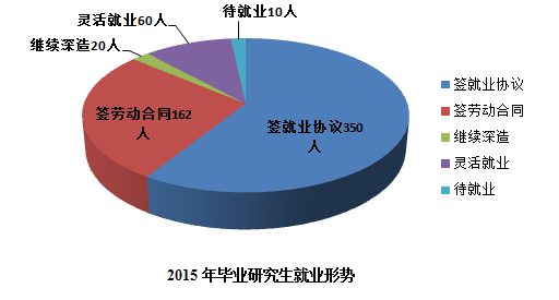 截止2015年9月底,我院602名毕业研究生中596名毕业生确定去向(硕士569名,博士27名),已定率达到99%。其中签就业协议350(硕士335,博士15人)人,签订劳动合同162人,签约率为85.05%。今年签约率较去年下降6.35%;通过各种方式深造12人(硕士6人,博士12人),占就业总人数的1.99%;灵活就业60人,占就业人数的11.53%。待就业10人。2015年毕业生就业形势如下图所示