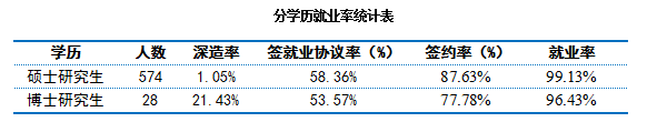 574名硕士研究生中,有3人选择国内深造,3人出国深造,深造率1.05%,335人签订就业协议书,签就业协议率为58.36%;有502人签约,签约率为87.63%。有569人就业,其中1人自主创业,2人自由职业,3人担任北京村官,就业率99.13%。28名博士研究生中,6人已上博士后,深造率21.43%,15人签订就业协议书,签就业协议率为53.57%;有21人签约,签约率为77.78%;有27人就业,其中1人自主创业,就业率96.43%。