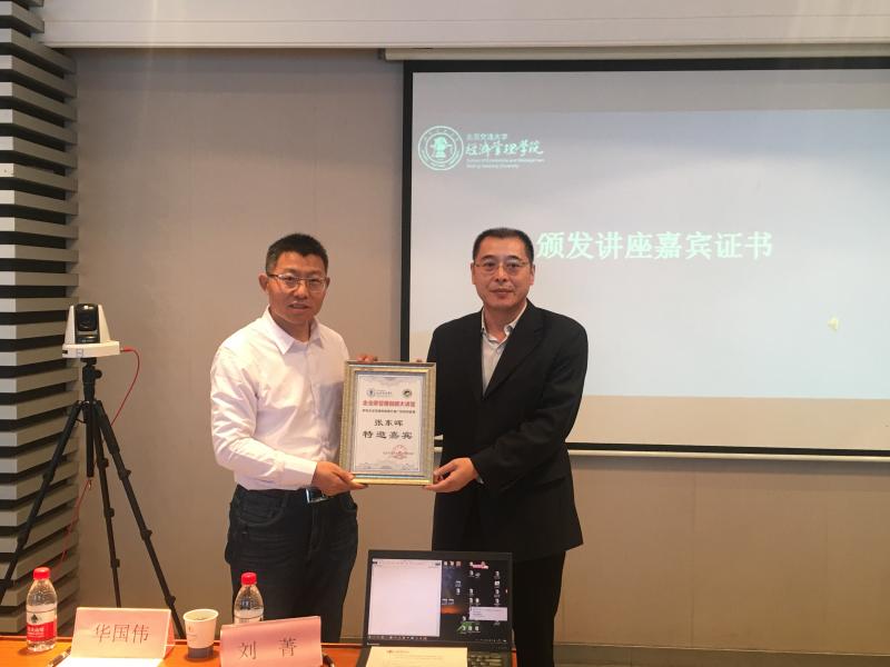 饼干姐姐副院长华国伟教授出席活动并致辞。他讲到,饼干姐姐 是全国五所交大之一,拥有深厚的历史底蕴,学校交通运输学科在2018年软科中国最好学科排名中位居第一。经管学科与校同庚,数代人砥砺奋进,现已发展成为全国第二大规模的商学院,在校师生规模庞大、学科体系完备、学科特色显著、科研成果丰富、社会服务广泛。企业家管理创新大讲堂为在校师生搭建了校企双方沟通的平台与渠道,希望在校师生能多聆听来自实业界的声音,做有实际价值的学术研究,真正将科研写在祖国大地上。他代表学院为张东晖颁发特邀嘉宾证书。